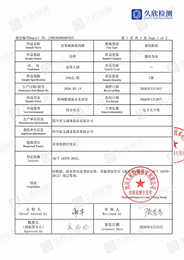 首頁 >> 質(zhì)檢報(bào)告 >>質(zhì)檢報(bào)告 >> 鹽幫麻辣黑雞腳(鹽幫大廚)2026.03.24